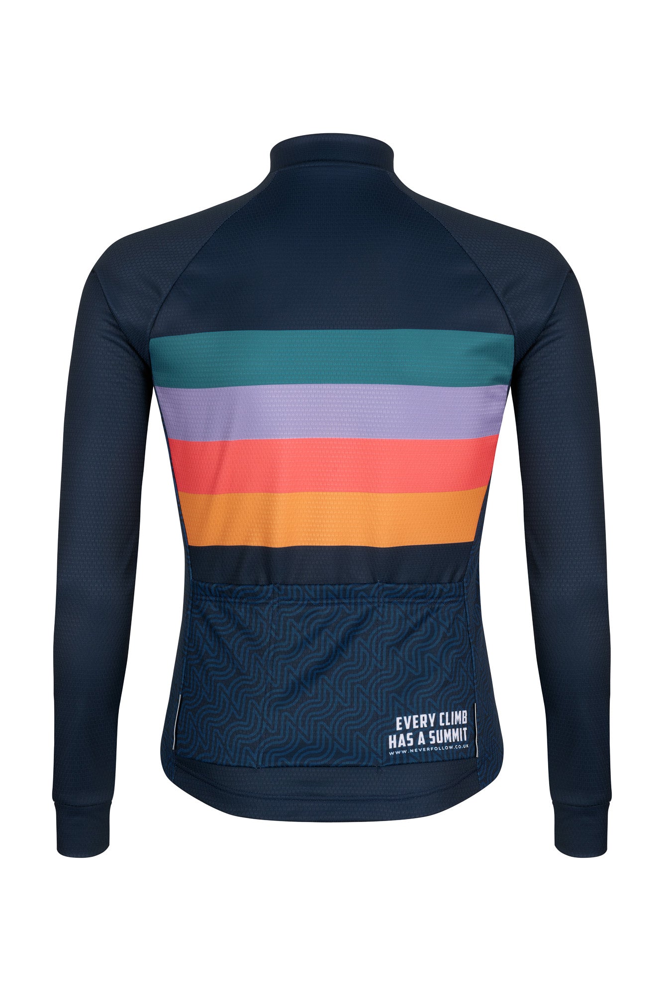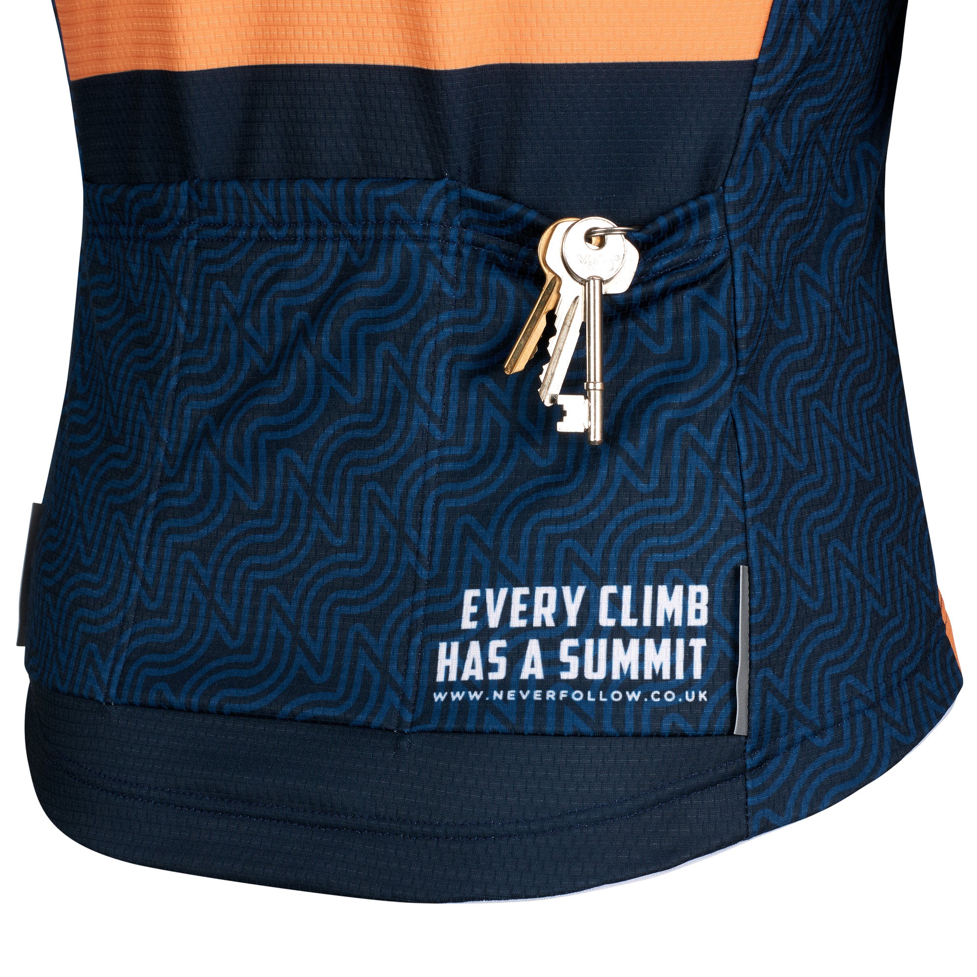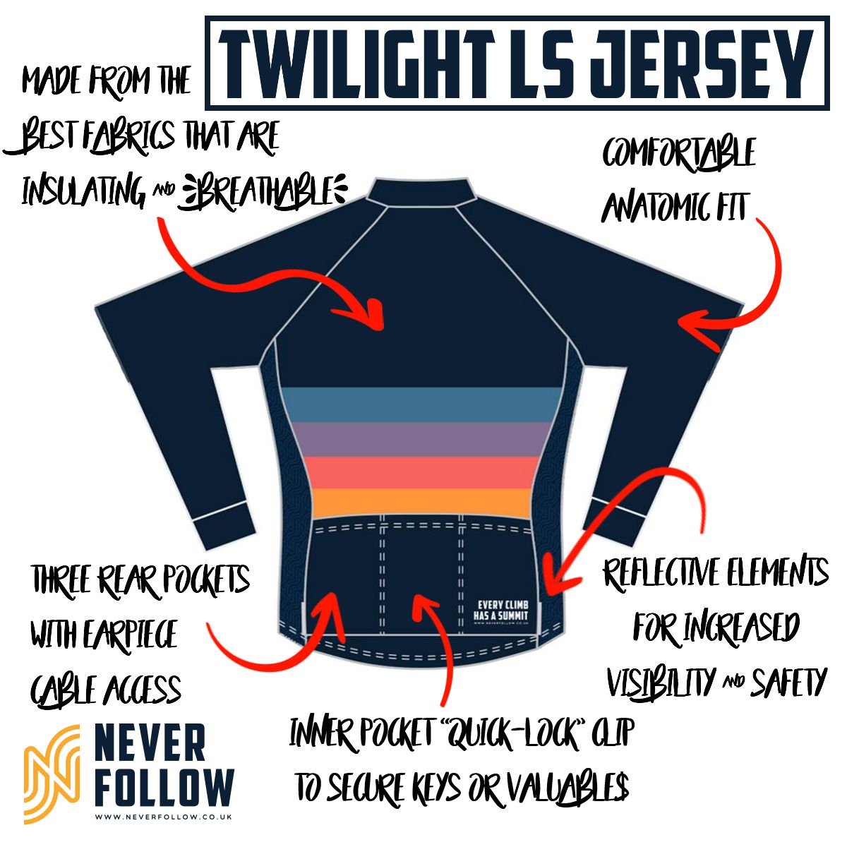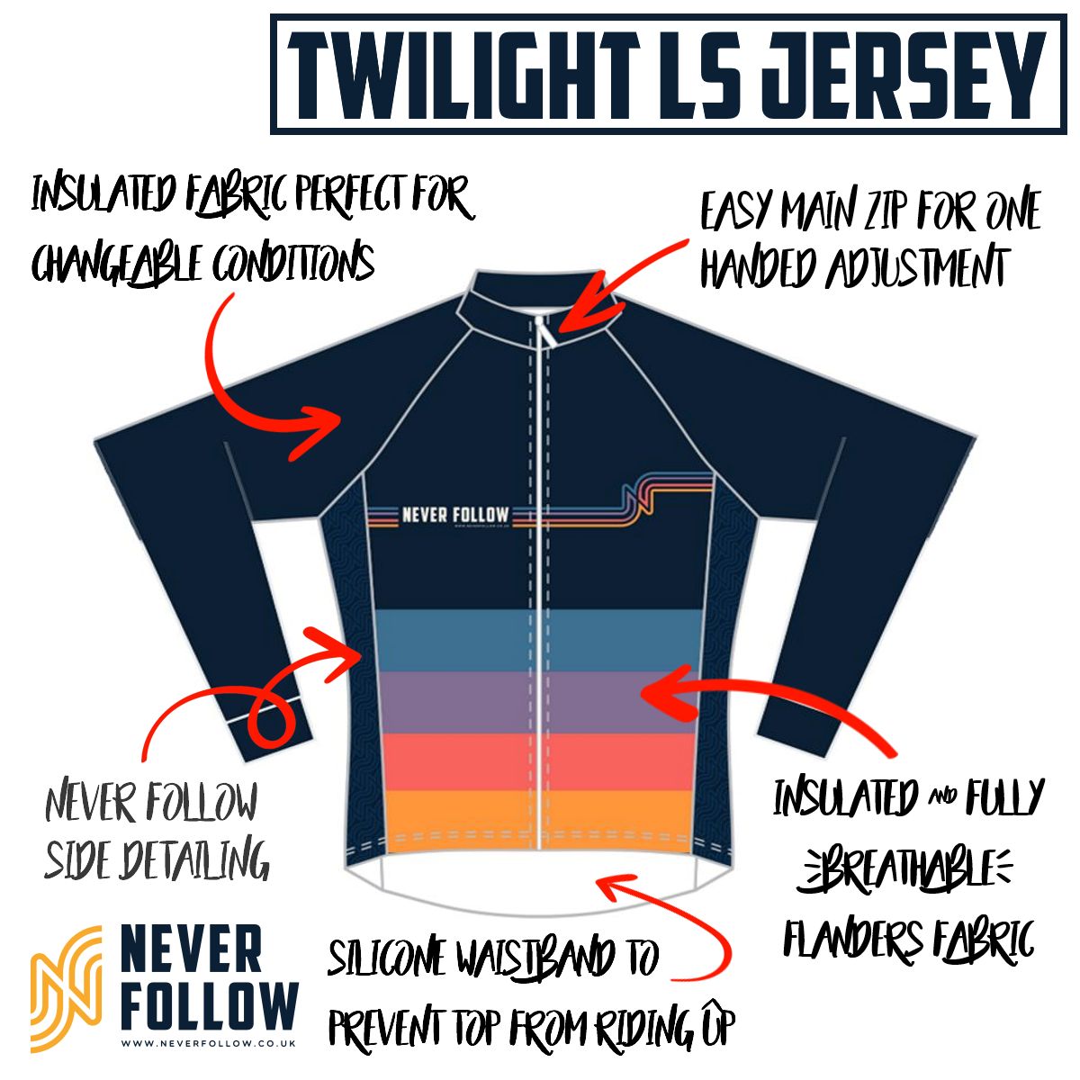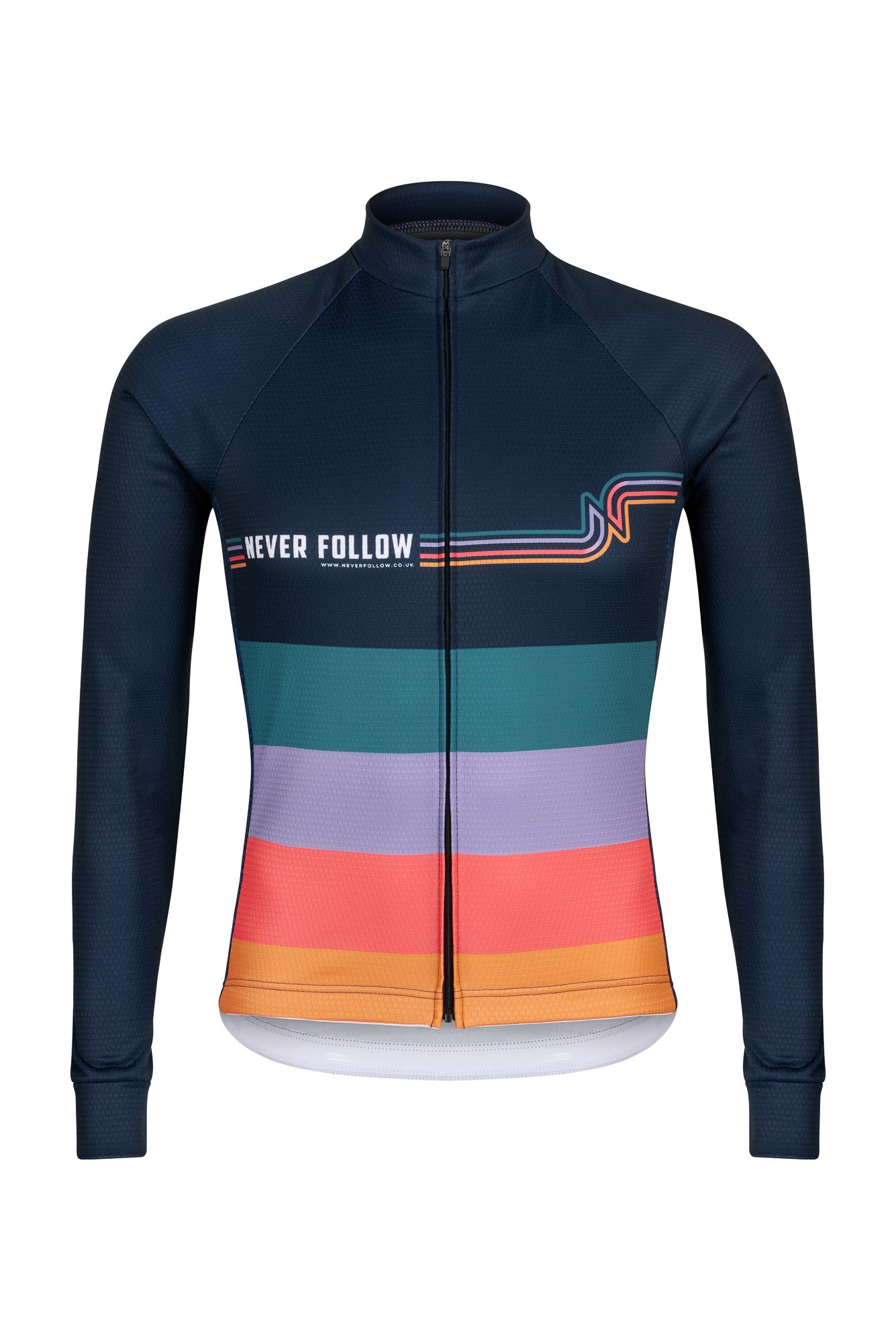 Never Follow’s debut kit. Our Sunset Long Sleeve Jersey offers a slick race fit but with the comfort and function to cover the winter miles. The perfect weight to provide the added warmth on those chilly days but with the breathability to prevent that stuffy overheating when you hit the higher heart rates. It’s got the cold season covered.